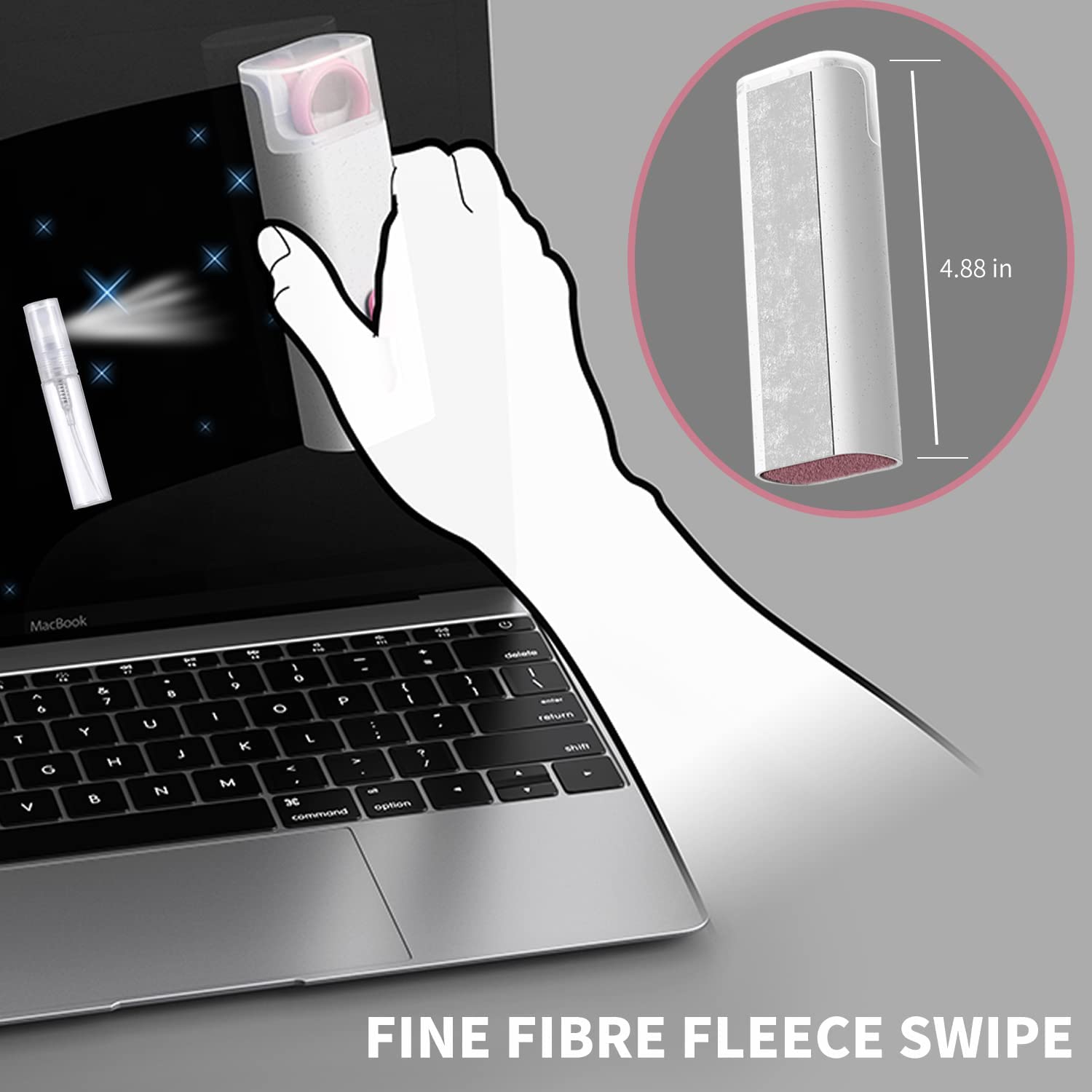 A fine fibre fleece swipe is attached to the back of the laptop cleaning kit box. You can fill cleaning liquid or water into the empty bottle included in the package, and use the fiber fleece brush to clean the computer screen, laptop screen, monitor, tablet, mobile phone screen, etc.